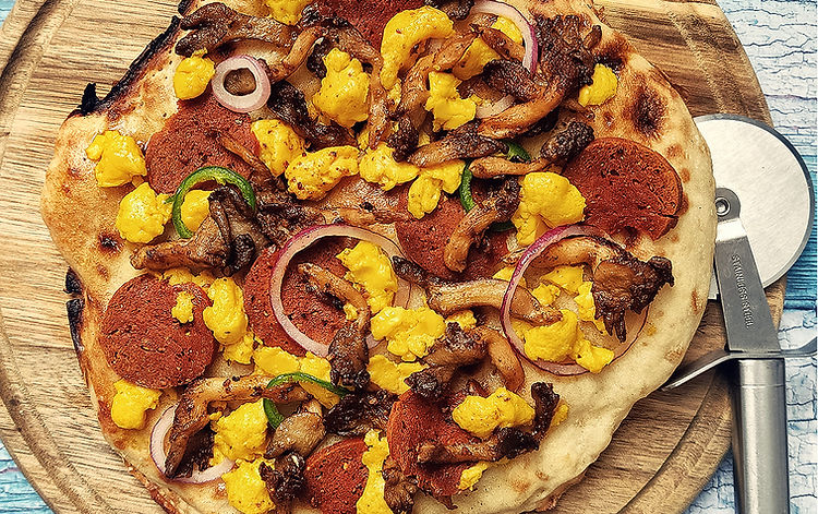 סאלוף, גבינת צ'דר טבעונית, פרוסות נקניק פפרוני טבעוני, טבעות בצל ופלפל חלפיניו